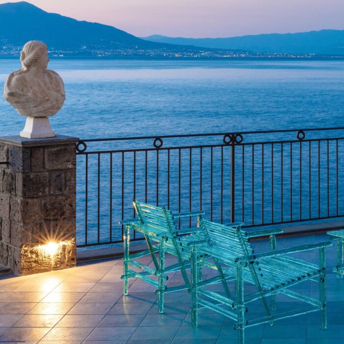 La poltrona A’mare di Edra, disegnata da Jacopo Foggini, è un raffinato simbolo del design italiano contemporaneo per l’outdoor. Realizzata interamente con bacchette di puro policarbonato lucidate a mano, presenta una struttura trasparente e luminosa che cattura la luce e i riflessi, creando un effetto poetico e scultoreo negli spazi all’aperto.
