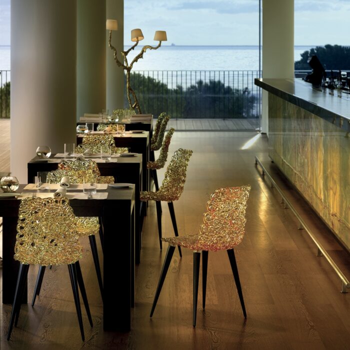 La sedia Gina di Edra, disegnata da Jacopo Foggini, è un raffinato esempio di design italiano contemporaneo. Realizzata artigianalmente in policarbonato, si distingue per trasparenza, riflessi luminosi ed eleganza scultorea, diventando una presenza decorativa oltre che una seduta funzionale.