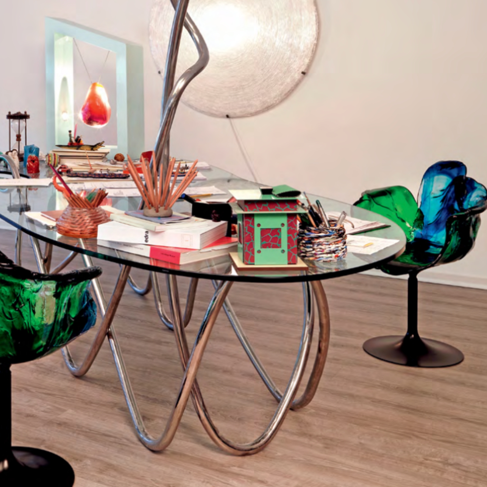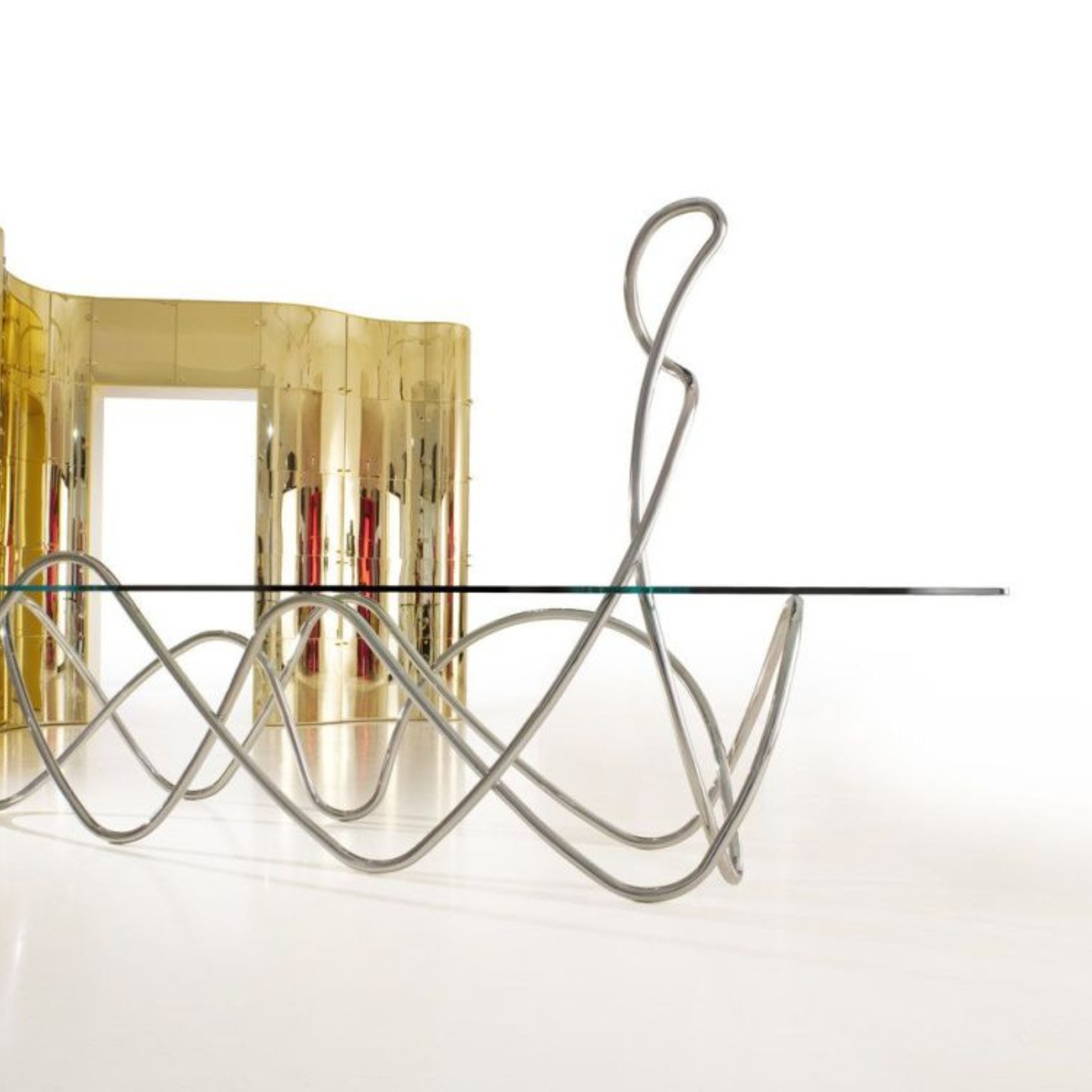 La struttura è composta dall’intreccio di due sistemi sinuosi di tubolare metallico, piegati a mano con maestria artigianale, che sostengono un elegante piano in cristallo. L’unione di metallo e vetro esalta solidità e trasparenza, creando un contrasto scenografico tra leggerezza e forza. Ogni tavolo riflette la visione artistica di Jacopo Foggini, in cui il design incontra la scultura e l’artigianato diventa poesia.