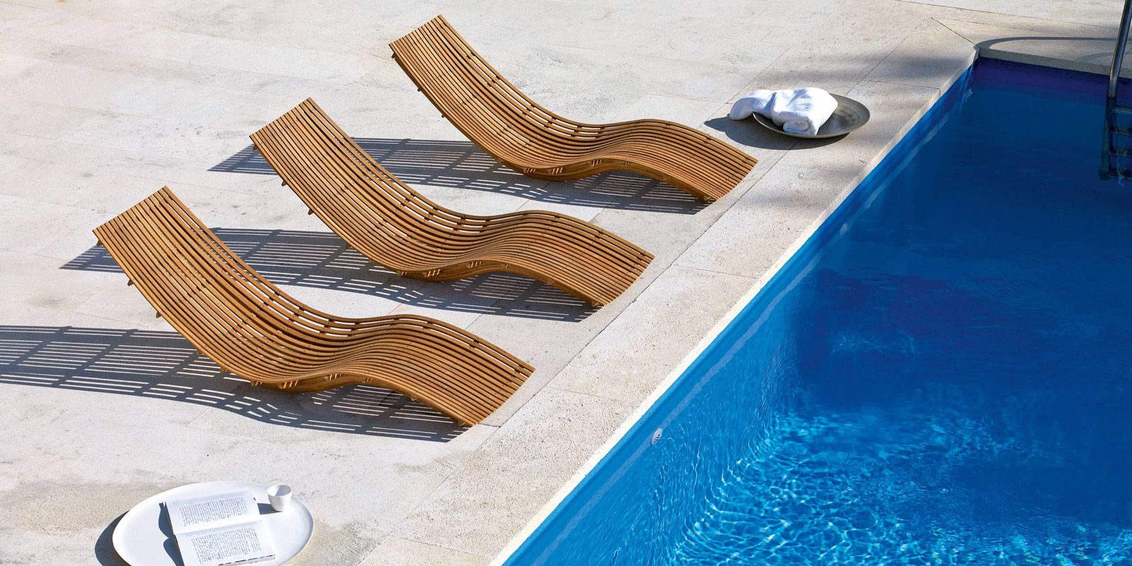 - Chaise Longue Swing: Chaise longue dalle linee sinuose e morbide che richiamano il mondo orientale. Struttura in teak, materiale molto resistente adatto per gli spazi esterni. Perfetta per il bordo piscina o per una terrazza in cui rilassarsi al sole.