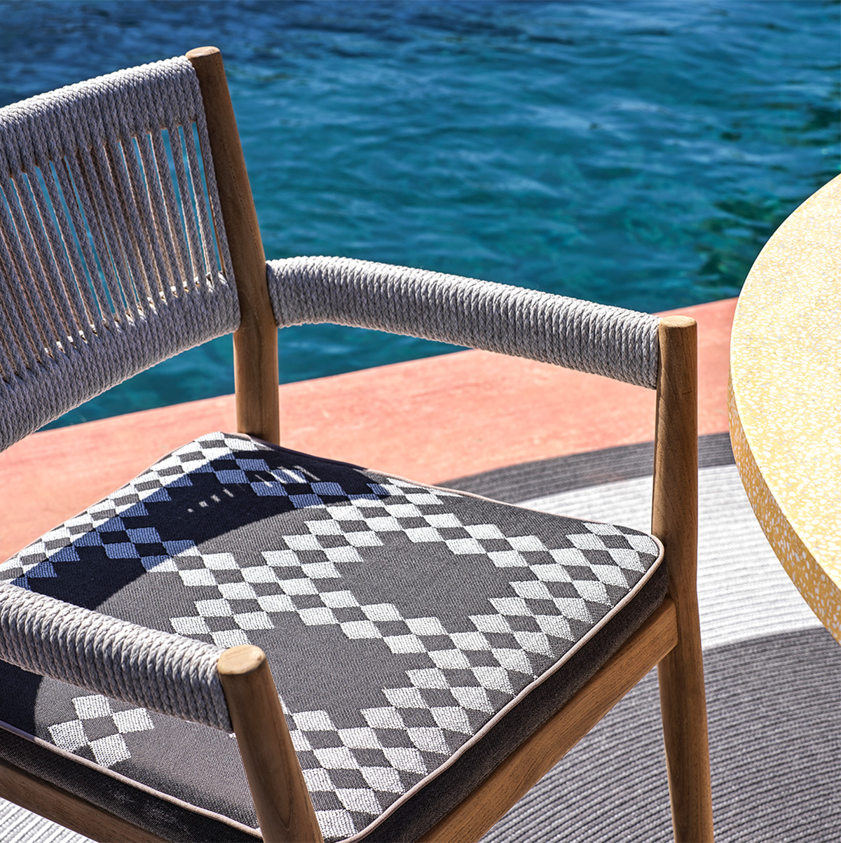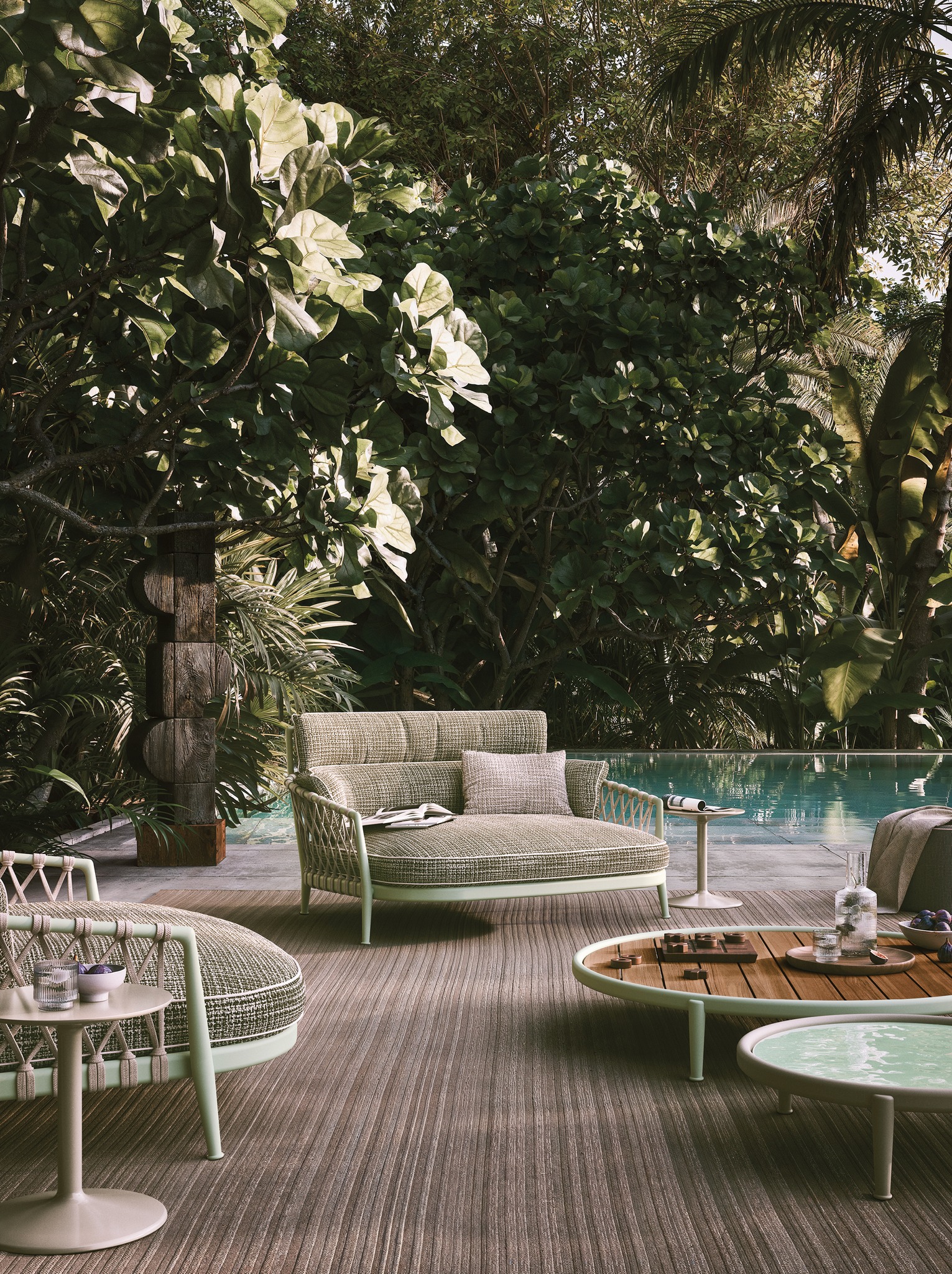 La zona piscina richiede arredi resistenti al sole e all’umidità senza rinunciare all’estetica.