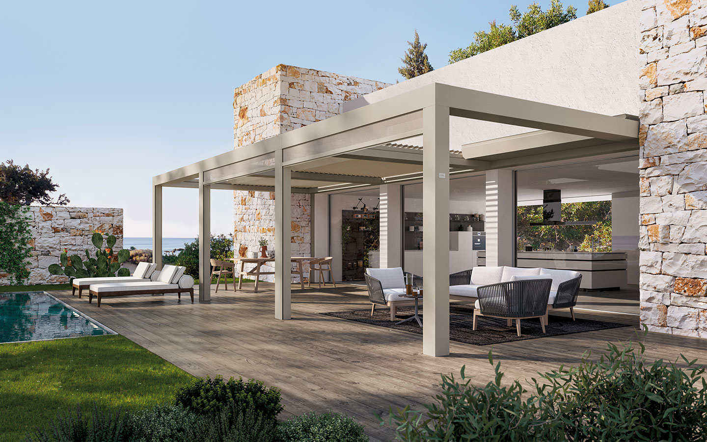 La protezione solare è parte integrante del progetto outdoor: le pergole bioclimatiche Pratic , come i modelli Opera, Brera e Carrera, regolano luce e ventilazione naturale, rendendo lo spazio fruibile per tutta la stagione. Veri e propri strumenti progettuali personalizzabili in tutte le proprie componenti.