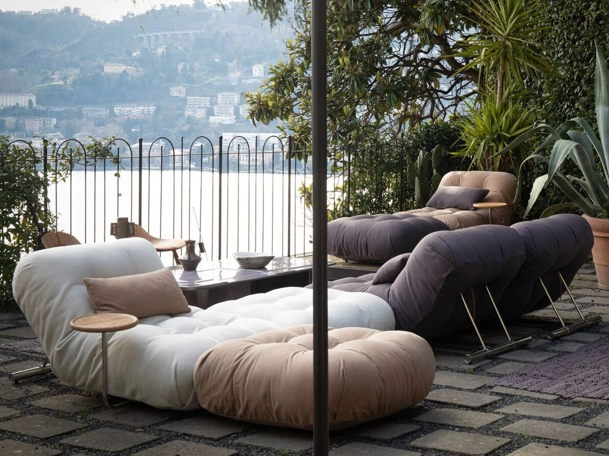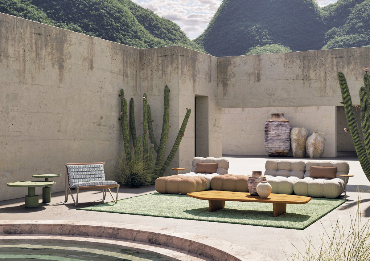 Il sistema Insula di Kettal permette composizioni flessibili e intercambiabili, mentre divani come Butterfly o Hybrid di B&B Italia garantiscono continuità stilistica con gli interni. La ricerca tessile di Paola Lenti introduce palette sofisticate e materiali tecnici resistenti così come Baxter propone un nuovo modello di divano chiamato Eileen.