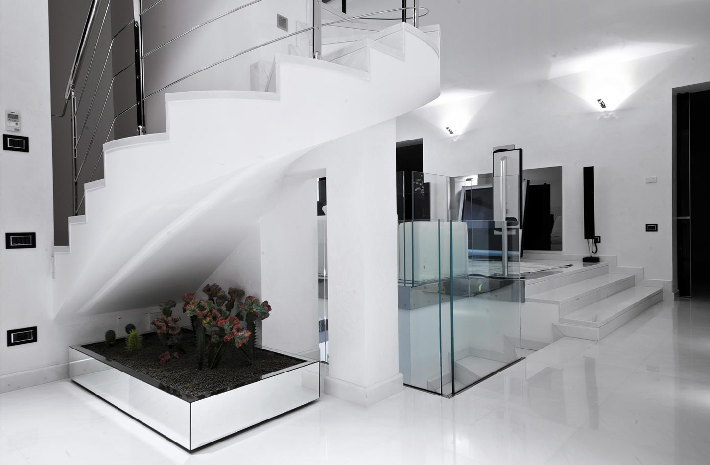 La caratteristica principale di questo edificio è quella di essere composto da spazi piccolissimi ma molto luminosi. Le scale sono il punto focale della casa e il nostro team ha voluto metterle in risalto utilizzando materiali leggeri e dettagli trasparenti. Questa è stata la migliore soluzione progettuale per incastonare le scale con la cucina al primo piano e il soggiorno al secondo, entrambi pensati come open space.