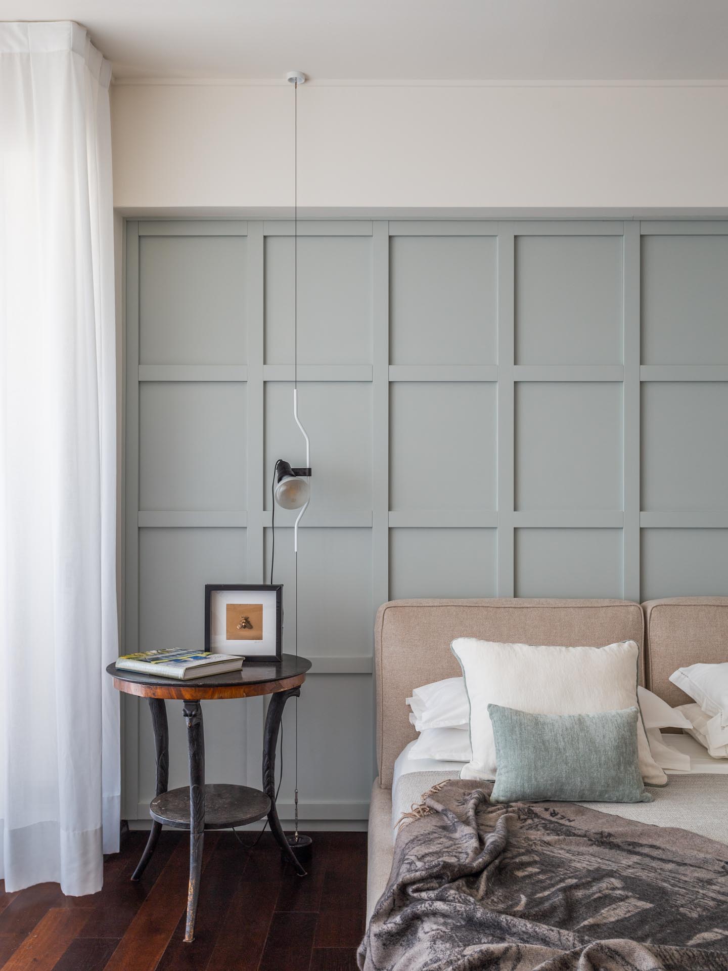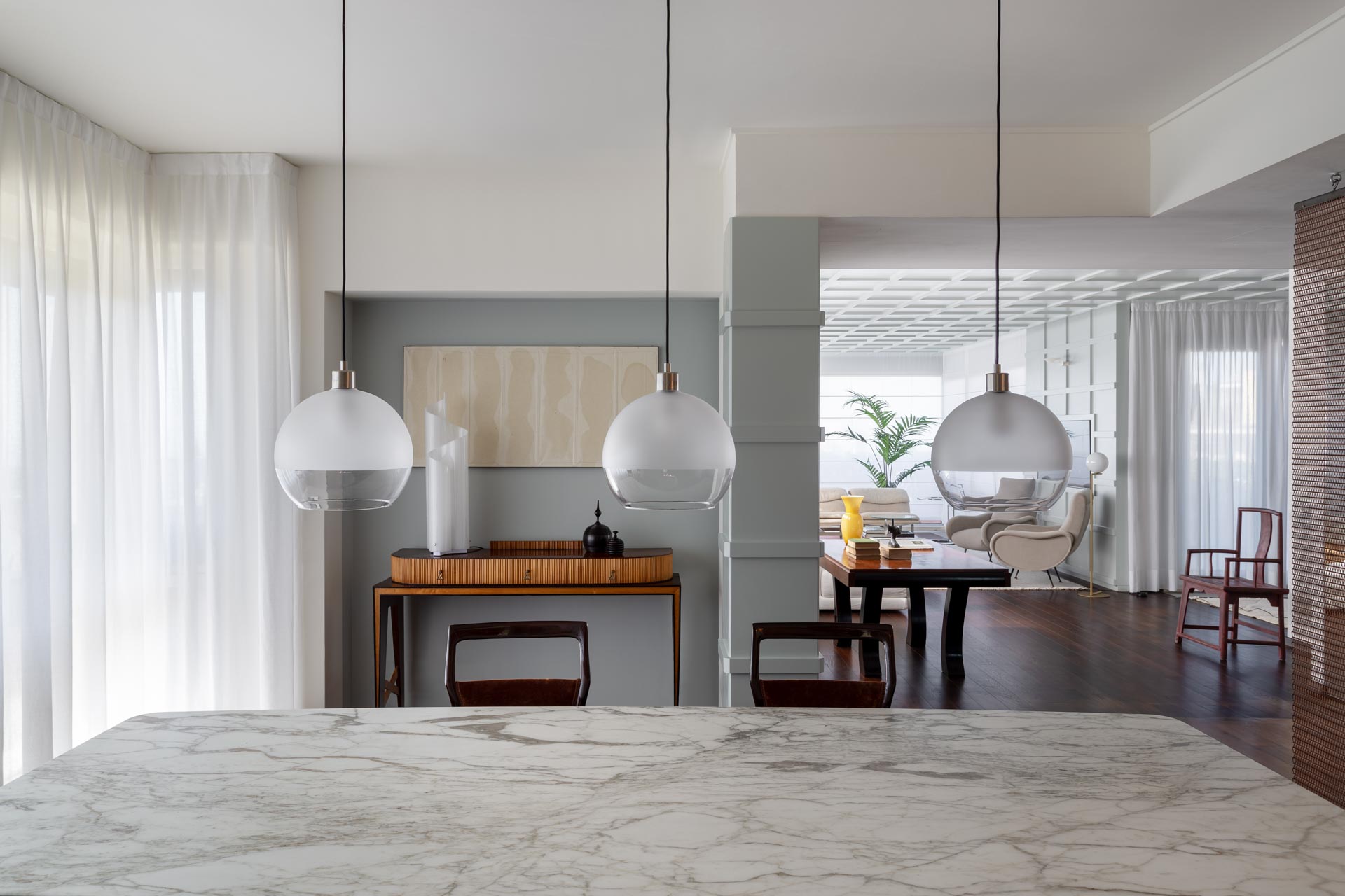 Per le scelte d’arredo, sono stati abbinati brand di design ad arredi e complementi d’arredo vintage rivisitati, conferendo loro una nuova vita. Ad esempio, nella sala da pranzo, il tavolo Bolero Ravel di Poltrona Frau in marmo e noce canaletto è stato arricchito e valorizzato da sedie vintage completamente rivestite in velluto. La zona pranzo è delineata dalla leggera rete metallica custom in rame.