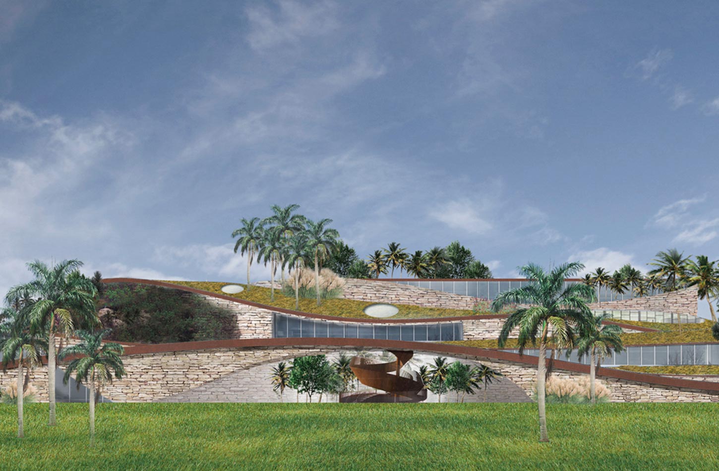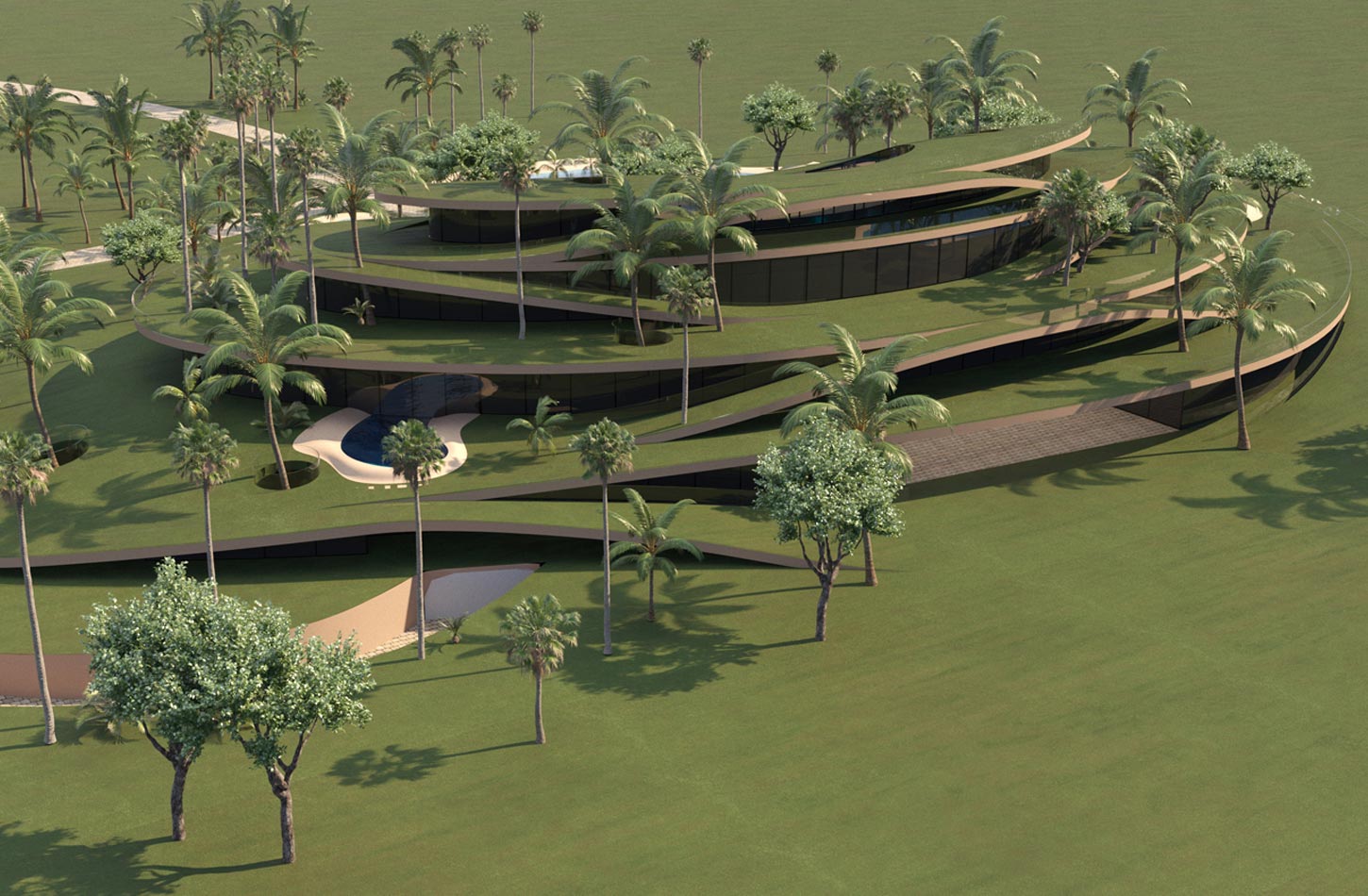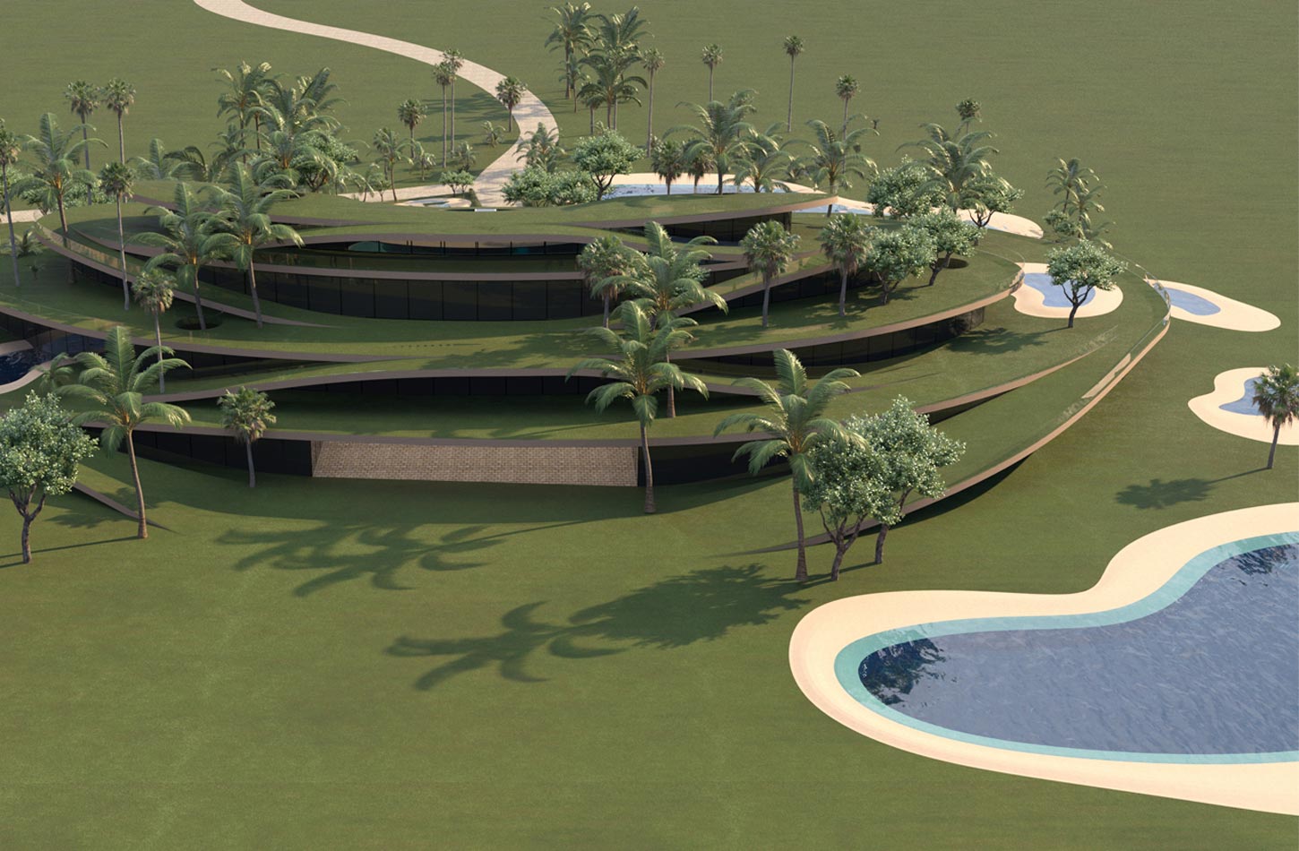 Per integrare nell’edificio lo sport preferito dal cliente, il progetto prevede un campo da golf che si estende su tutto il tetto e copre l’edificio, dando vita a una forma architettonica e un’esperienza abitativa uniche. Per dare un’idea delle dimensioni della villa, è distribuita su 4 piani e conta più di 8 camere da letto, che possono ospitare fino a 18 persone.