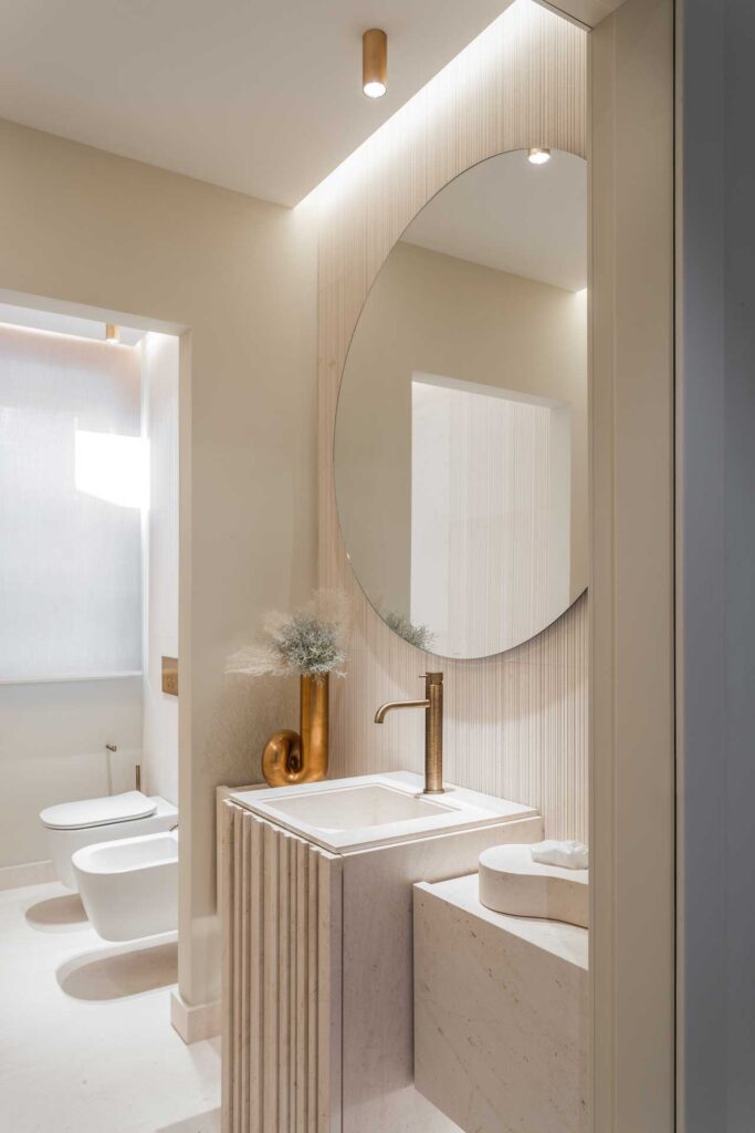Per i bagni di Villa V, è stato selezionato il marchio Salvatori, eccellenza del settore. Lo scopo è stato quello di conferire agli spazi eleganza e lusso attraverso linee pulite e decise. La bellezza delle diverse varietà di marmo scelte, unite ad una scrupolosa selezione delle finiture per rubinetterie e specchi realizzati su misura, ha garantito che gli ambienti riflettessero con precisione la classe e il raffinato gusto dell’intero progetto.