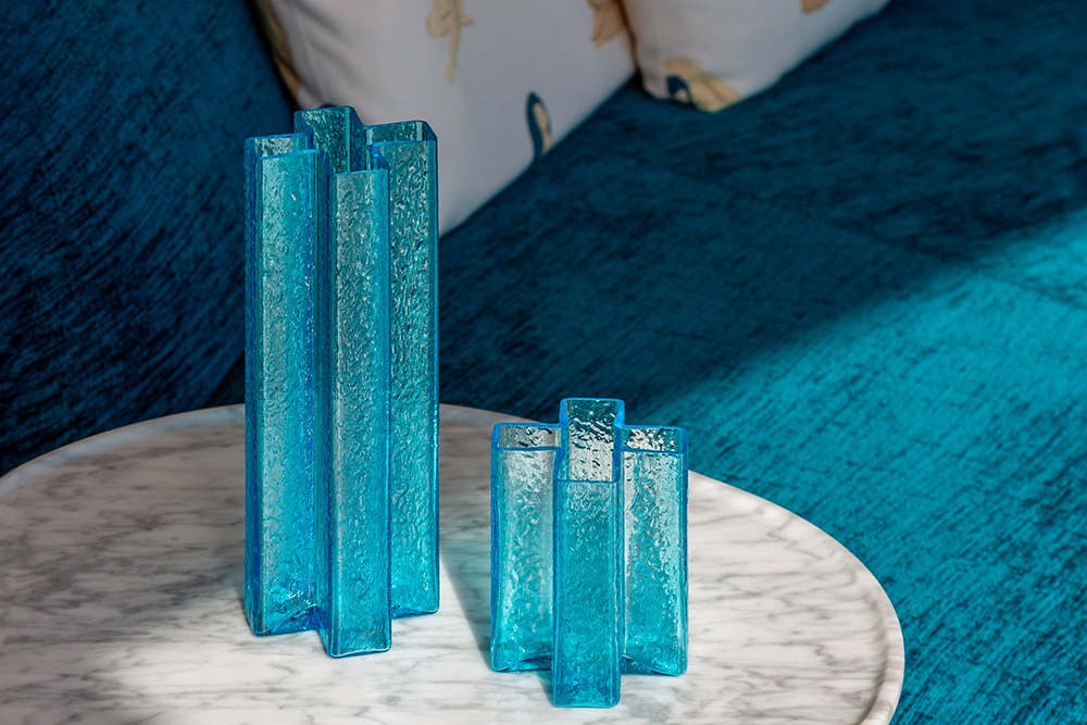 At the heart of the outdoor space, a partially raised pool features transparent seating from Edra’s A’mare collection, which appears to float effortlessly between light and reflections.